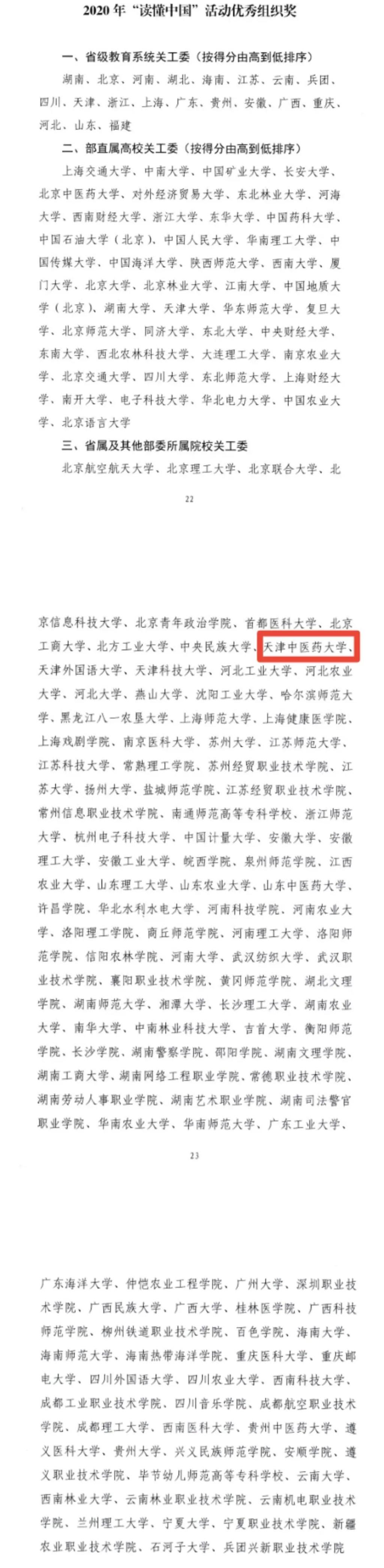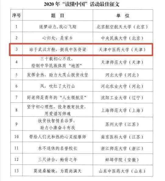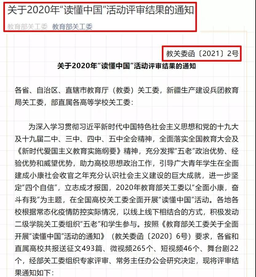 日前,教育部关工委下发了《关于2020年“读懂中国”活动评审结果的通知》(教关委函[2021]2号)文件,教育部关工委组织专家对各省和部直属高校推荐的493篇征文、265个微视频、46个短视频、22个舞台剧进行了认真的评审,最终评选出最佳征文60篇、最佳微视频30个、最佳短视频10个、最佳舞台剧4个。我校中医学院勇搏学子王梓亮的征文《战于武汉方舱,挺我中医脊梁》、获2020年“读懂中国”活动最佳征文奖,并将参加“读懂中国”节目组现场录制,《传承抗疫精神,致敬人民英雄--向张伯礼院士学习》微视频获2020年“读懂中国”活动最佳微视频奖于2月15日至20日在中国教育电视台一套(CETV1)播放,学校荣获教育部2020年“读懂中国”活动优秀组织奖。