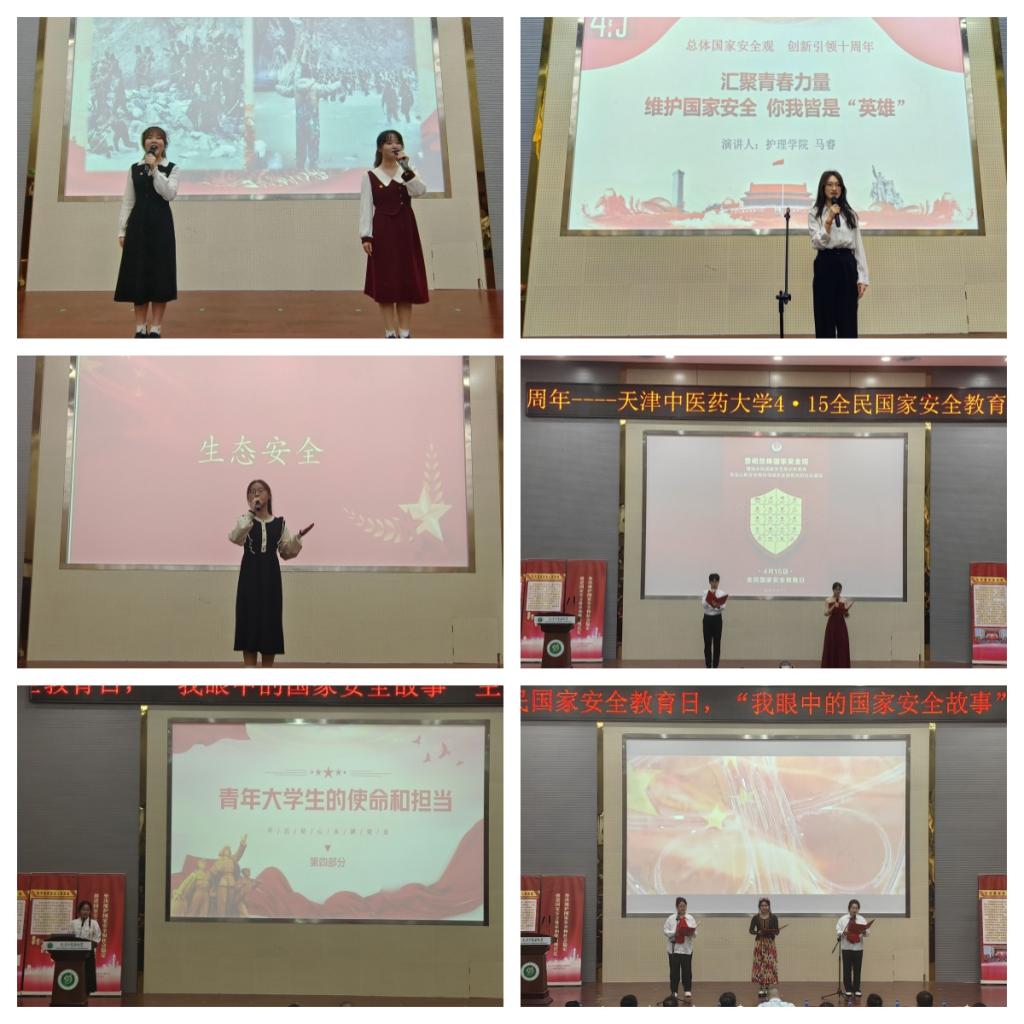 2024年是习近平总书记提出总体国家安全观十周年,4月15日是第九个全民国家安全教育日。为深入学习贯彻习近平总书记关于全面加强国家安全教育的重要指示批示精神,认真落实总体国家安全观,推动我校全民国家安全教育工作广泛深入开展,增强全体师生的国家安全意识,提升国家安全素养,我校于4月18日在求真报告厅举办总体国家安全观,创新引领十周年——天津中医药大学4·15全民国家安全教育日“我眼中的国家安全故事”主题演讲比赛。大赛由党委学工部主办,护理学院承办。