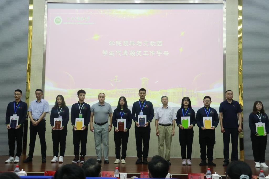“高举旗帜,胸怀梦想;牢记使命,勇于担当; 谨记天中校训,进德修业、继承创新;弘扬天中精神,支教有我、请党放心!”……全体支教团师生进行了庄严宣誓。一声声铿锵有力的誓言传递着天中人燃烧青春的渴望,表达着他们不忘初心,履职尽责,不负青春,不负韶华的坚定信念。支教团学生派出单位,管理学院、文化与健康传播学院、体育健康学院领导上台,为支教团学生代表颁发支教工作手册。