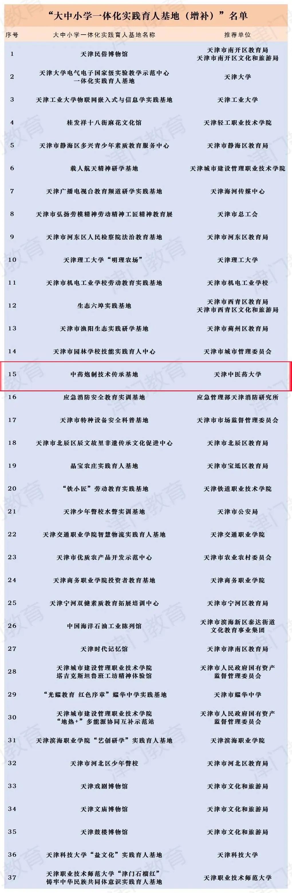 为促进文化传承与教育融合,打造高质量研学实践教育网络,服务天津高质量发展,市教育两委牵头开展了全市中小学生研学实践资源推荐评审工作。根据相关通知要求,党委学工部积极组织申报与遴选推荐工作,经推荐申报、实地考核及专家综合评定,我校中药学院中药炮制技术传承基地入选“大中小学一体化实践育人基地(增补)”名单。