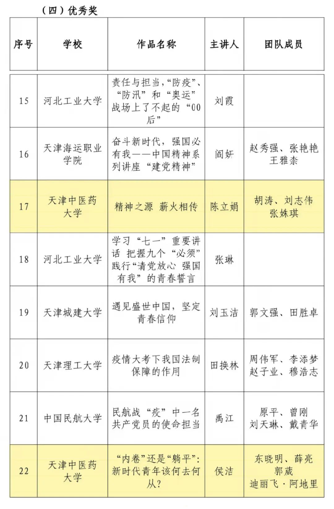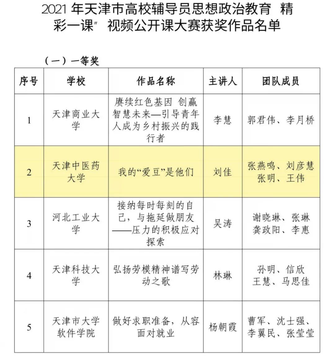 其中由我校辅导员刘佳作为主讲,张燕鸣、刘彦慧、张明、王伟作为成员的团队作品《我的“爱豆”是他们》荣获本届公开课大赛一等奖,该作品通过长津湖革命战士的英雄事迹对比流量“小鲜肉”的饭圈文化、新时代“人民英雄”我校张伯礼院士的伟大抗疫精神和我校护院学子们投身武汉疫情区的感人事迹、2035年的远景目标三个方面,课程内容紧贴实际,指导性强,将作为优秀课程作品在全市推广展示。