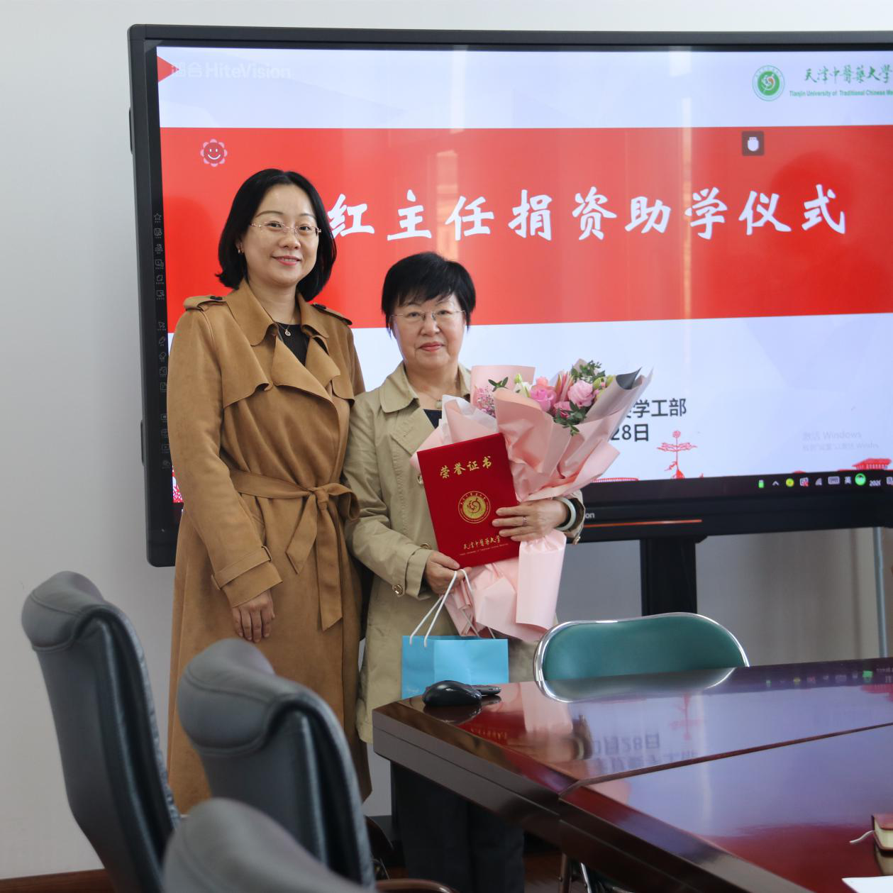 随后,受助同学给颜红主任献花表达感激之情,学工部张岚部长向颜红主任颁发荣誉证书并对颜红主任的慷慨资助表示敬佩和感谢,张部长说:颜主任在深耕医术,钻研专业的同时,仍然不忘回馈母校,捐资助学。将大爱的精神传递给天中学子,让我们感到很钦佩,希望同学们能够不辜负颜红主任的一片热忱和殷殷教诲,怀揣一颗感恩的心,不断提高自身修养,争取早日学有所成,顺利完成学业的同时,在同学中发挥榜样示范作用。